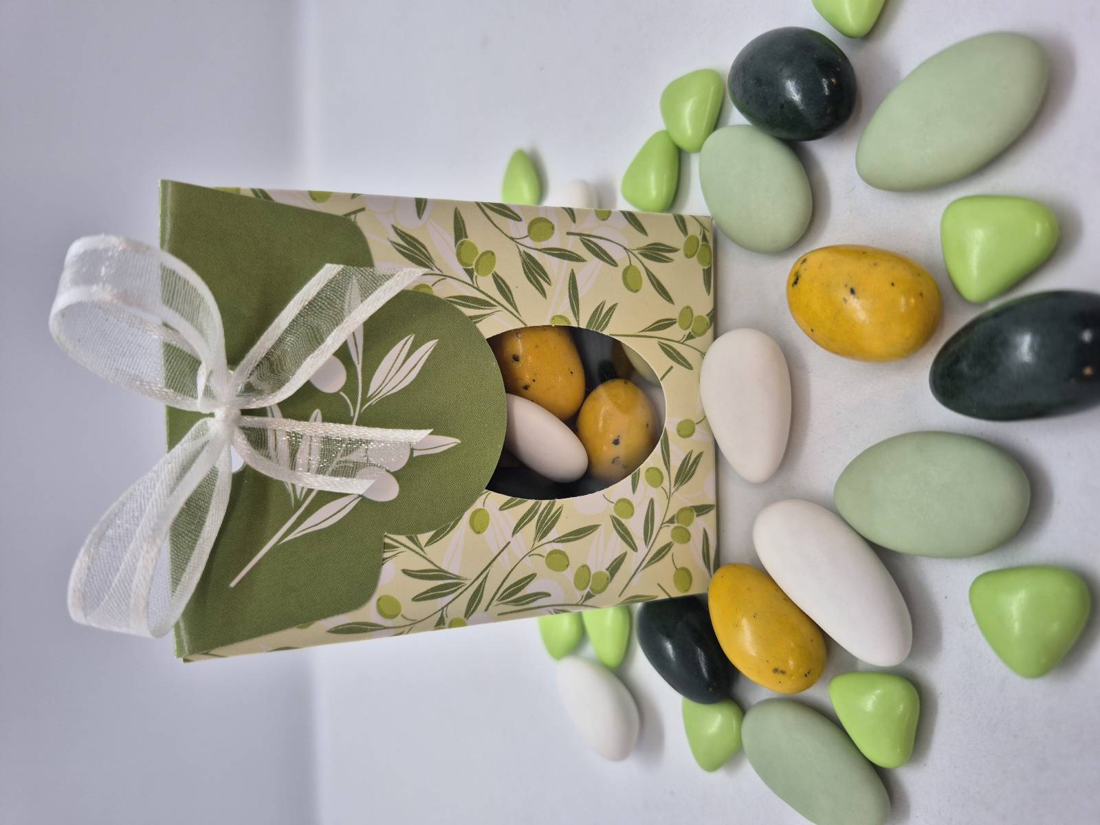 POCHETTE BRANCHE D'OLIVIER garnie d'un mélange de 50gr de dragées au choix. (Amande, Noisette, chocolat ou d'autres spécialités..), Couleurs de dragées assorties à votre décoration de table et (ou) votre environnement. Finition avec ruban + étiquette prénom. Livré monté, prêt à offrir